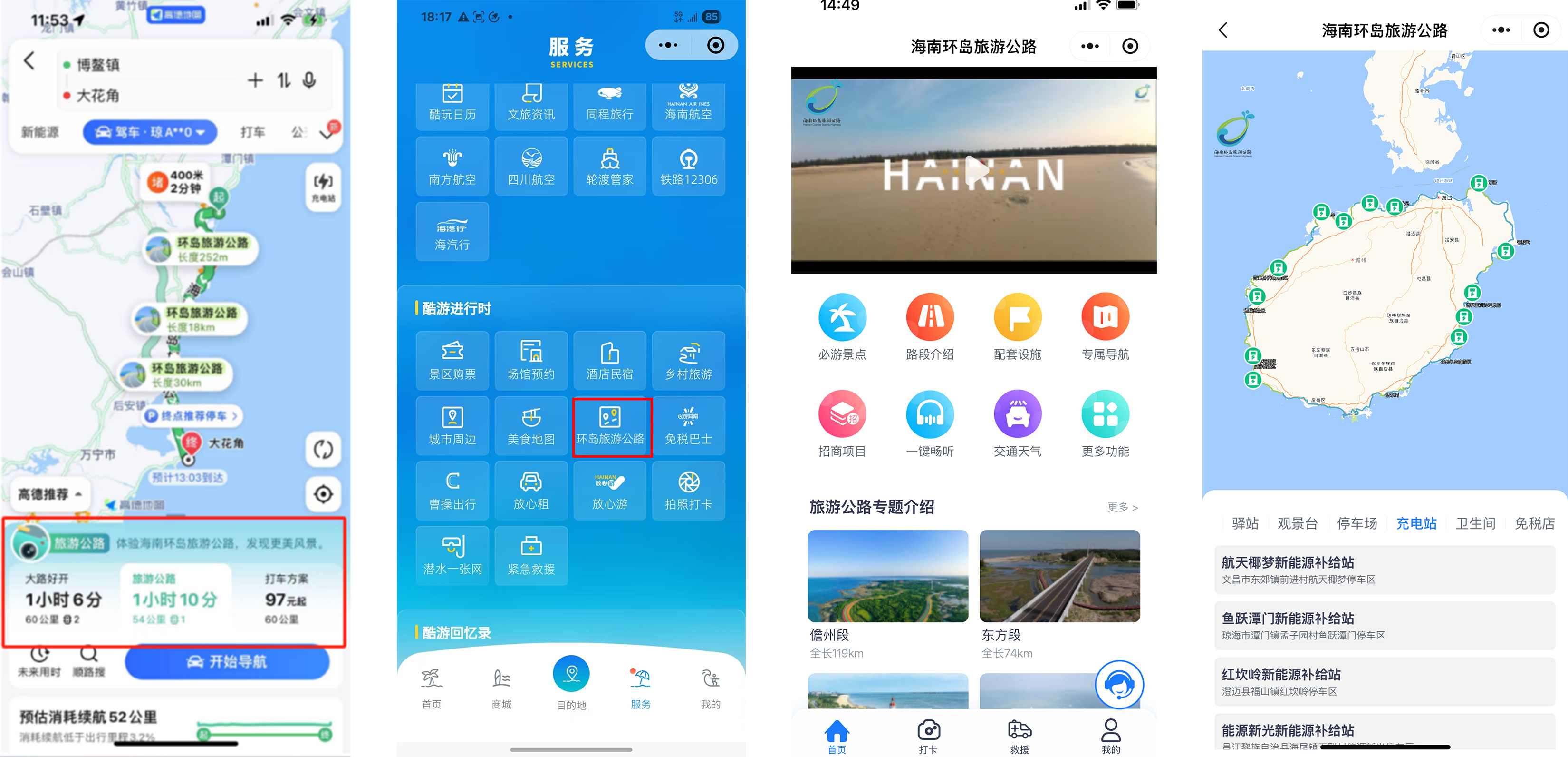 云控中心通过与路侧可变情报板,以及“智游海南”、“椰城市民云”、“交通有我”等本地主流服务平台对接,提供实时、精准、全面的交通信息服务,提升游客与市民出行体验。出行前,可查询沿途景点与实时路况;出行中,可获取周边充电桩、租车点、免税店、救援维修等信息,还能使用与高德地图、百度地图联合打造的旅游公路专属导航功能;出行后,可使用失物招领等功能。