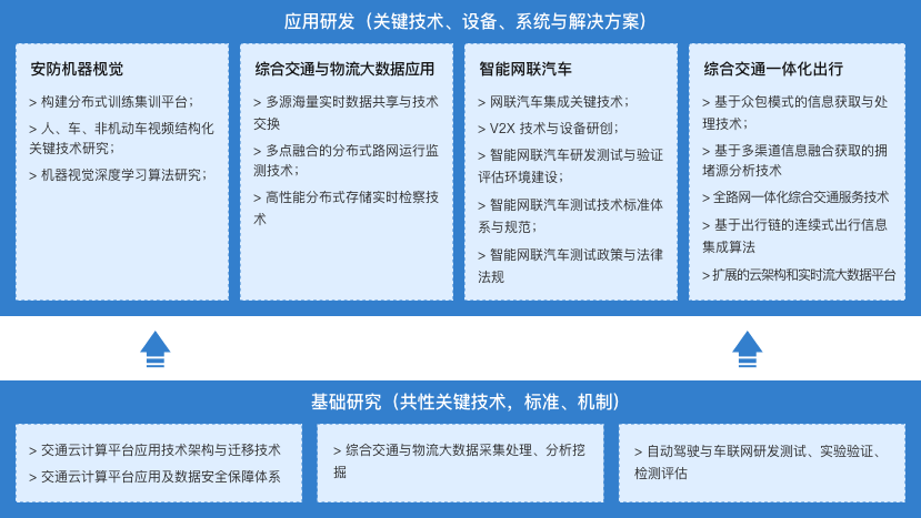 重点围绕城市交通、公路交通、轨道交通、民航、水运等领域开展自主研发,在标准研究、关键技术研发与设备研制及产学研技术合作方面开展工作。