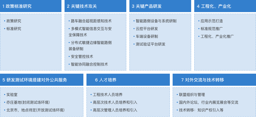 致力于改变传统的智能交通模式,实现车车、车路、人车之间的主动安全协同和基础实施资源的合理分配,用“智慧的路”拉动“聪明的车”,推动人工智能+自动驾驶产业的快速发展。通过建立车路协同自动驾驶技术创新平台,形成车路协同自驾驶成套标准、产品与解决方案,建成国内权威、全面的车路协同自动驾驶测试验证平台,实现技术创新成果的应用示范和产业化。